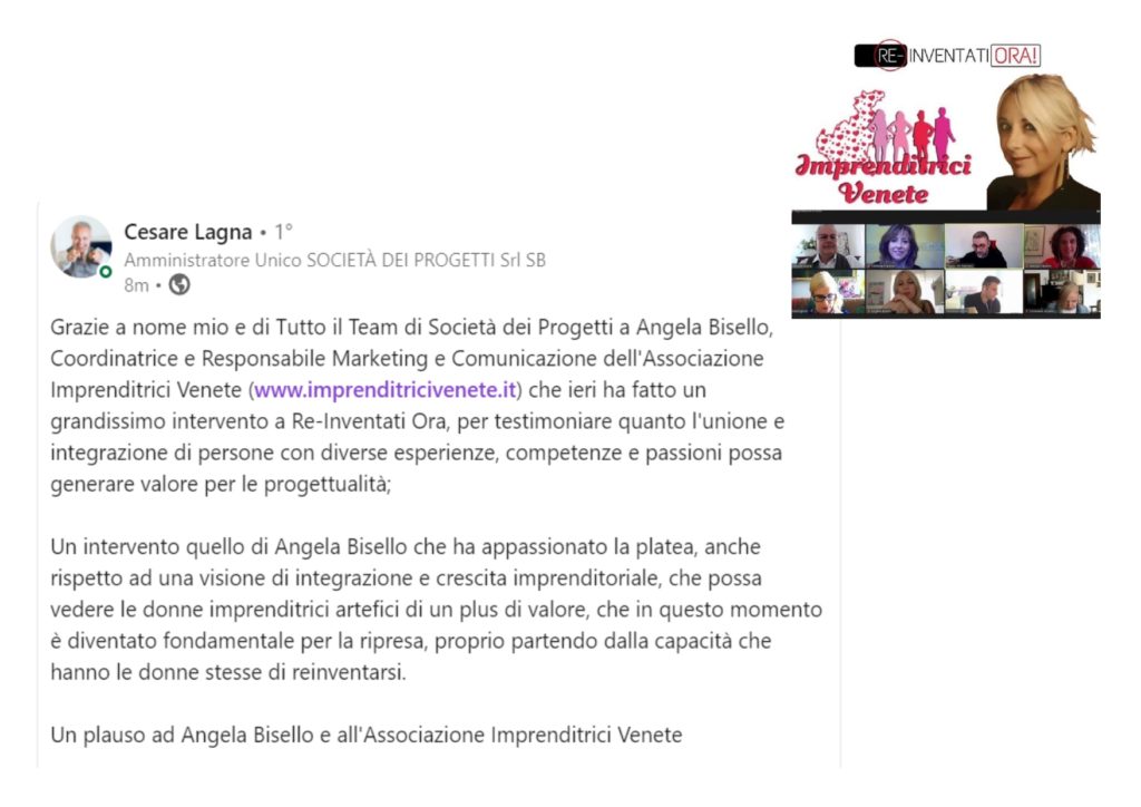 Grazie a nome mio e di Tutto il Team di Società dei Progetti a Angela Bisello, Coordinatrice e Responsabile Marketing e Comunicazione dell’Associazione Imprenditrici Venete (www.imprenditricivenete.it) che ieri ha fatto un grandissimo intervento a Re-Inventati Ora, per testimoniare quanto l’unione e integrazione di persone con diverse esperienze, competenze e passioni possa generare valore per le progettualità;
